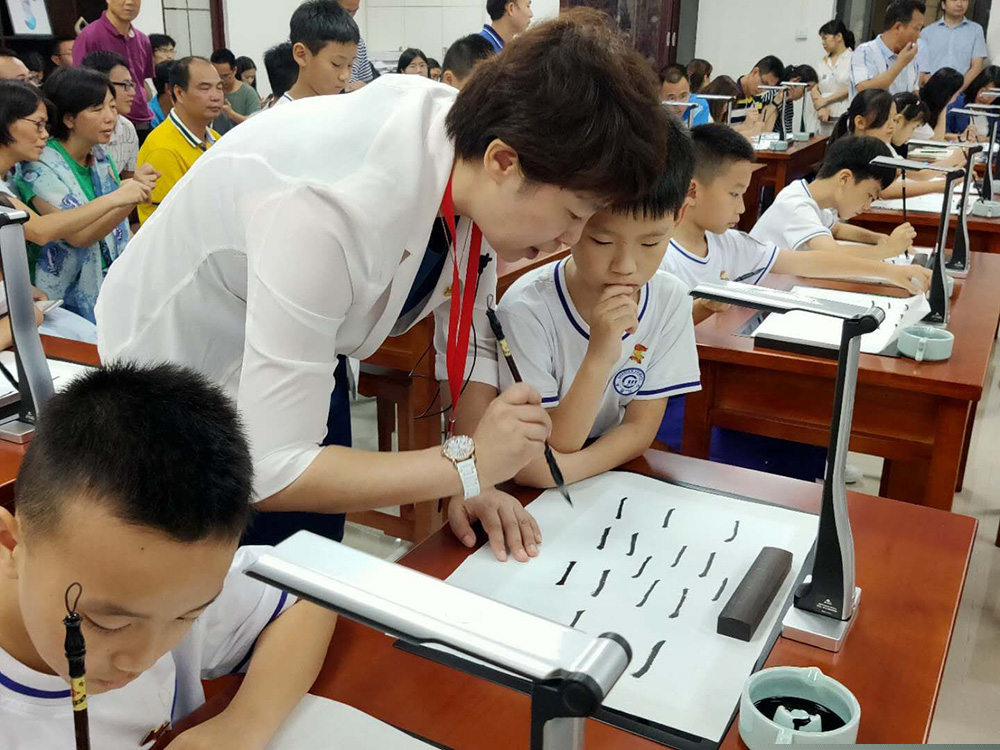 課堂上,姚丹校長通過吉星的書法系統,即時的展示自己的書寫過程,一筆一劃讓臺上臺下一目了然。對于書寫中的細節,老師邊寫邊逐步分析。
