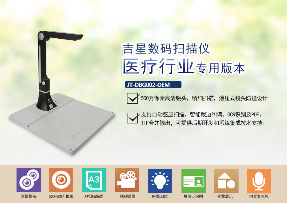 吉星數(shù)碼掃描儀醫(yī)療行業(yè)專用版 JT-DBG002-OEM a4幅面 500萬像素 帶硬墊底座